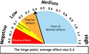 After the conference, I decided to re-read Visible Learning through the lens of searching for high-yield strategies to improve pedagogical practice.  If you have not read the book, Hattie defines a term called the "hinge point"--this is the point at which it can be said that a factor or innovation has a significant impact on student achievement, and is the average #impact of all of the factors/innovations in the six categories of student, home, school, teacher, curricula, and teaching.  The numerical value of this "hinge point" is 0.4.  Hattie goes on to say that we need to find strategies that go beyond these typical effects at the hinge point:  high-yield practices that move into the “zone of desired effects.  As a frame of reference, the factor with the highest impact on student had a value of 1.44, and the factor with the lowest (and in fact deleterious) effect was -0.34.